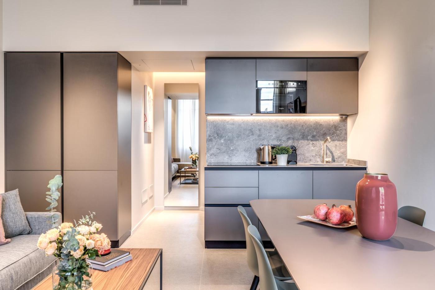 One-Bedroom Apartment. This apartment comprises 1 living room, 1 separate bedroom and 1 bathroom with a shower and free toiletries. Meals can be prepared in the kitchen, which comes with a stovetop, a refrigerator, a dishwasher and kitchenware. The apartment provides air conditioning, a washing machine, a tea and coffee maker, a wardrobe and a flat-screen TV. The unit offers 2 beds. ;