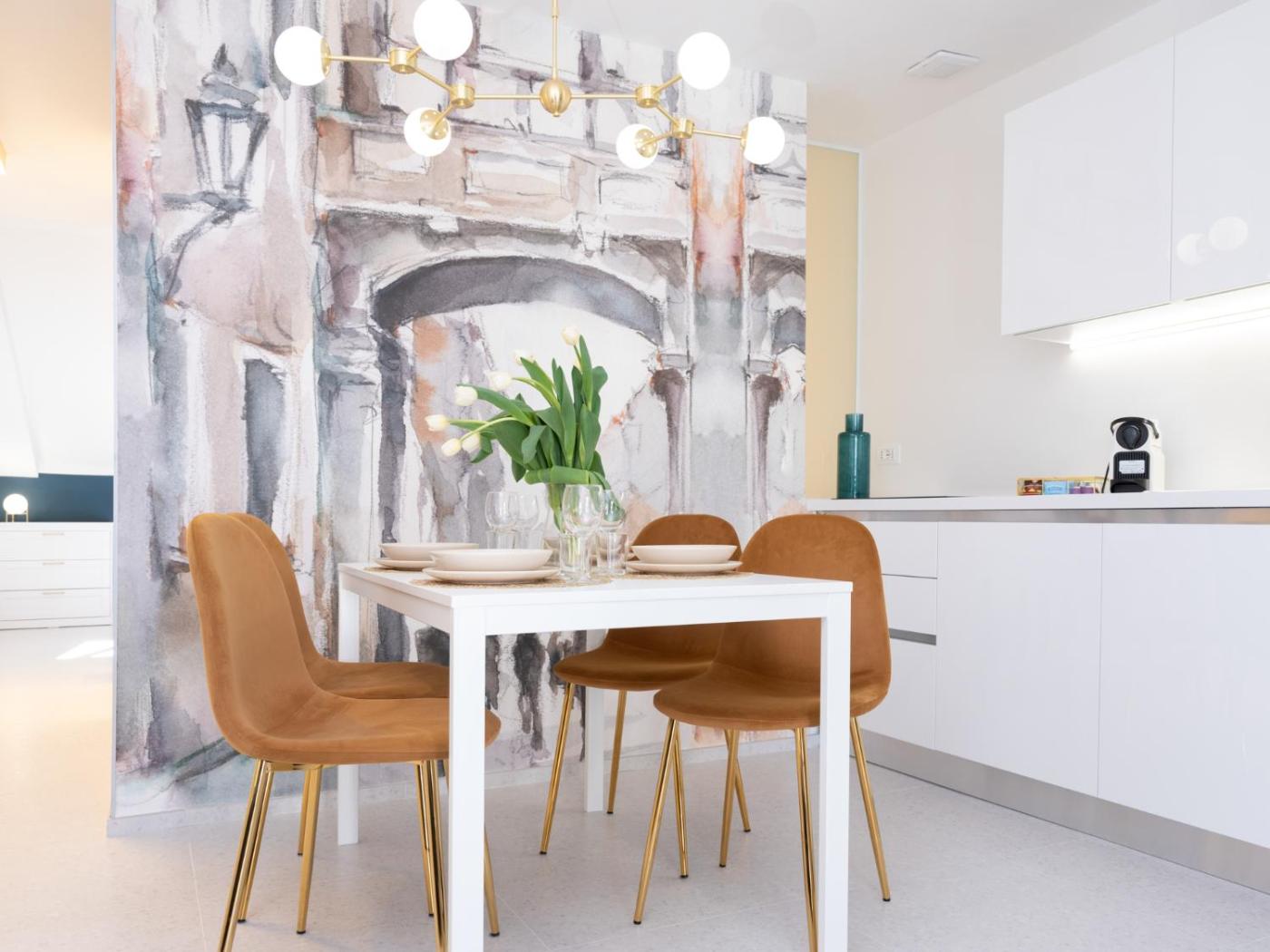 One-Bedroom Apartment. Boasting a private entrance, this air-conditioned apartment comes with 2 living rooms, 1 separate bedroom and 1 bathroom with a shower and a bidet. The fully equipped kitchen has a stovetop, a refrigerator, a dishwasher and kitchenware. The apartment is furnished with a desk and a seating area and features a washing machine, a tea and coffee maker and city views. The unit has 1 bed.